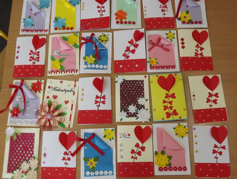 dowolną techniką kartki walentynkowe. Wszystkie pięknie przyozdobione