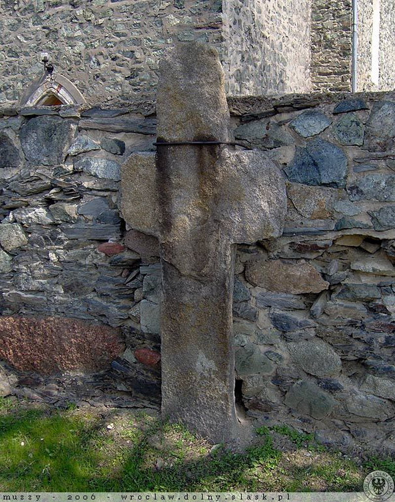 Krzyż pokutny w Wilczkowicach, granitowy, łaciński, prawie dwumetrowy, przyległy do muru cmentarza przykościelnego