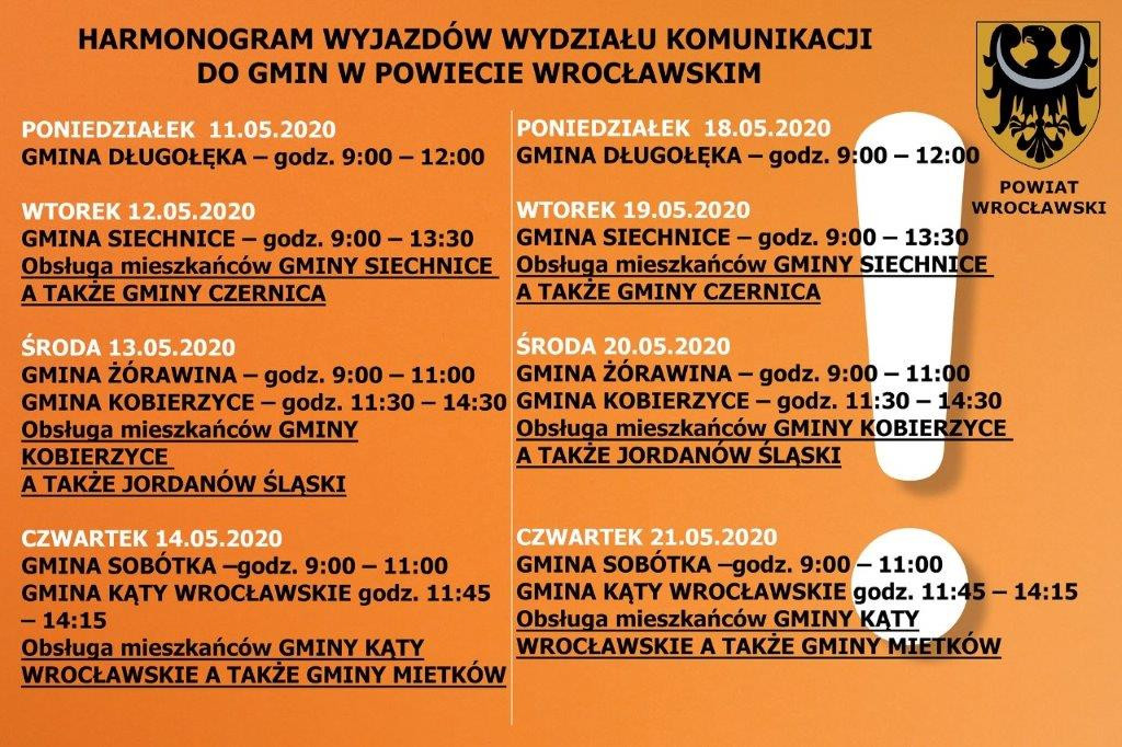 Harmonogram wyjazdów Wydziału Komunikacji do gmin w Powiecie Wrocławskim.